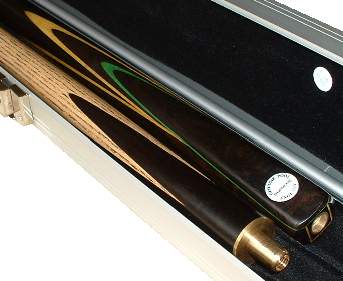Grade "A" Ash snooker cue with a genuine hand spliced Ebony butt, 4 hand spliced wood inlays and 6 inch Ebony Mini Butt. 3/4 Joint 2 piece cue with high quality quick release sheathed brass joint and 10 mm professional stick on tip. Ash grain darkened, weight medium, perfectly balanced with mother of pearl name plate. 57 inche cue. Hand made and finished over 2 days. RRP £299.99. (case not included). |