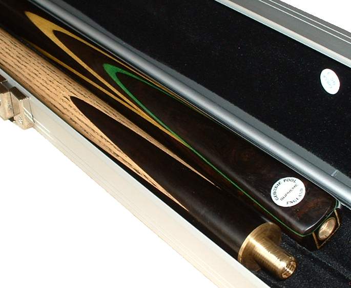 Grade "A" Ash snooker cue with a genuine hand spliced Ebony butt, 4 hand spliced wood inlays and 6 inch Ebony Mini Butt. 1/2 Joint 2 piece cue with high quality quick release sheathed brass joint and 10 mm professional stick on tip. Ash grain darkened, weight medium, perfectly balanced with mother of pearl name plate. 57 inche cue. Hand made and finished over 2 days. RRP £299.99. (free case not shown in picture).. |